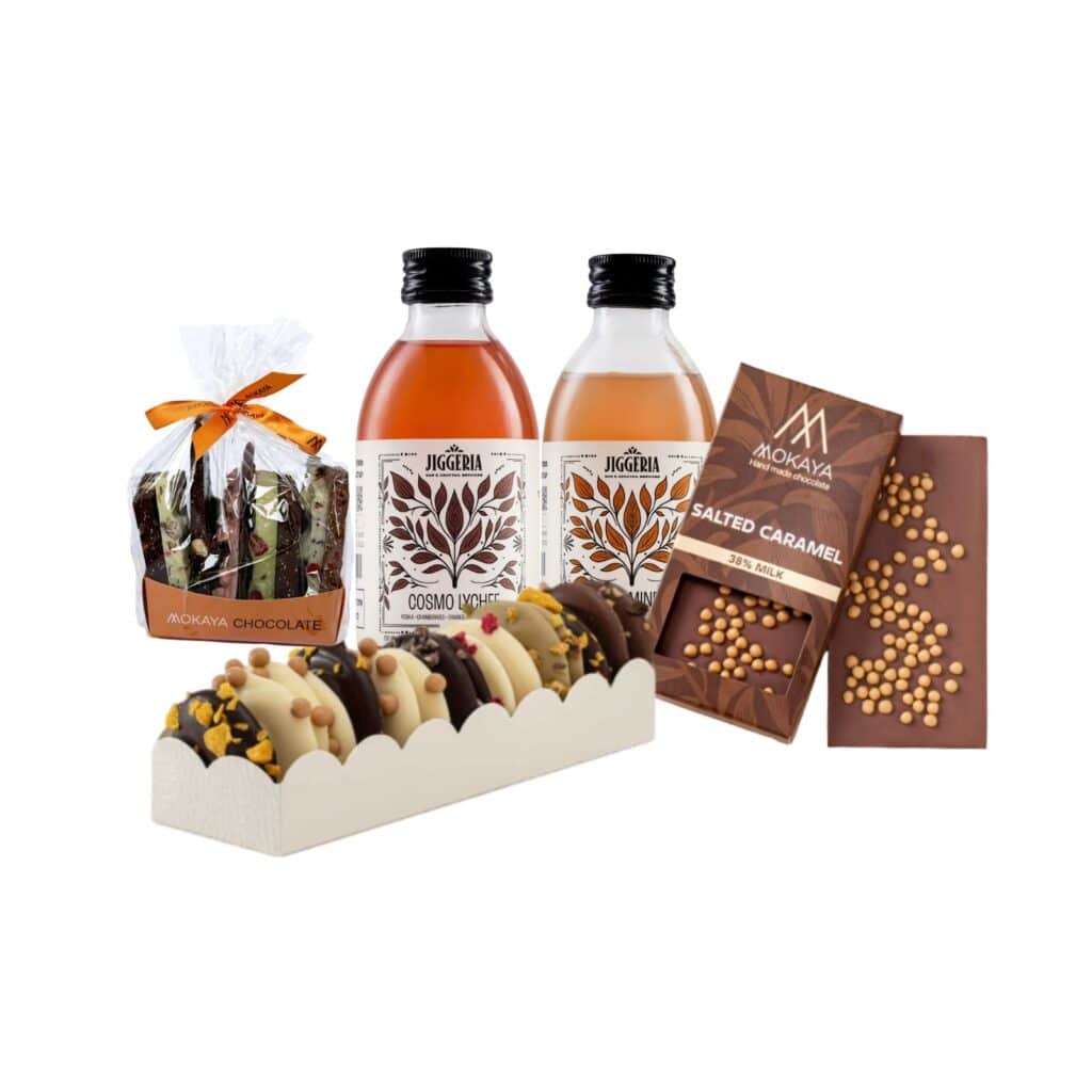 מארז מושלם לחגיגת יומולדת מבית מוקאיה שוקולד, הכולל שני קוקטיילים אישיים (200 מ״ל) לבחירתכם מבית ג’יגריה, מארז מדיאנטים מפנק, מארז שברי שוקולד טעימים וטבלת שוקולד בטעמים שונים. מתנה אידיאלית לכל חגיגה!