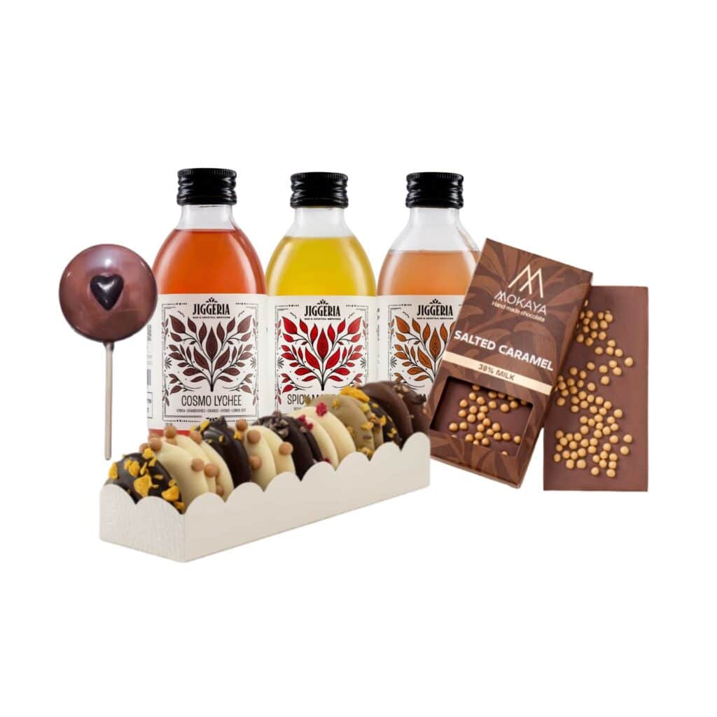 מארז מפנק מבית מוקאיה שוקולד, המשלב את הטעמים העשירים של ג’יגריה עם שלושה קוקטיילים ייחודיים אישיים (200 מ״ל) , טבלת שוקולד בטעמים משתנים, מארז מדיאנטים מרהיב, ושוקולד על מקל בעיצוב לב עסיסי.